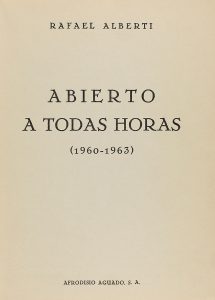 1964. (1ª EDICION-GENRRACION 27). ALBERTI, RAFAEL: ABIERTO A TODAS HORAS. Madrid: Afrodisio Aguado, 1964. 8º mayor. 112 p., 1 h. Rústica. Primera edición.