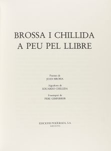 1996. (ARTE). BROSSA, JOAN; CHILLIDA, EDUARDO; GIMFERRER, PERE: BROSSA I CHILLIDA A PEU DEL LLIBRE. Barcelona: Eds. Polígrafa, 1996. Folio menor. 36 p. Frontispicio de Pere Gimferrer, poemas de Brossa e ilustr. de Chillida. Rústica. Edición...
