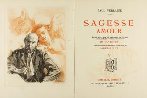 1937. (BIBLIOFILIA). VERLAINE, PAUL: SAGESSE AMOUR. Edition revue sur les manuscrits de l´auteur accompagnée de notes et variantes para Ad. Van Bever. Paris: Rombaldi edit., 1937. 8º mayor. 297 p. Ilustr. con 5 láms. en color de Lobel-Riche....
