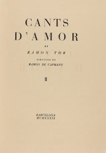 1939. (BIBLIOFILIA). TOR, RAMON; CAPMANY, RAMON DE [ilustrador]: CANTS D´AMOR. Barcelona: Imp. Victòria. 1939. 8º menor. Rústica. Edición numerada limitada a 200 ejemplares firmados por el autor.