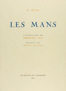 1947. (BIBLIOFILIA). PONS, IU: LES MANS. S.l.: Les Edicions de Vallparadís, 1947. 4º menor. 112 p. Ilustrado con litografías de GERTRUDIS GALI y grabados al boj de MAGI ELIAS. Papel de hilo con barbas. Ejemplar en rama en rústica presentado en...