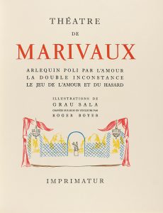 1956. (BIBLIOFILIA). MARIVAUX: THEATHRE DE MARIVAUX. Ilustr. Grau Sala, gravées sur bois en couleurs par Roger Boyer. Paris: Presses de Coulouma, 1956. 2 vols. en 4º menor. I: 274 p., 3 h.; II: 260 p., 3 h. Ilustr. de Grau Sala. Enc. en media...