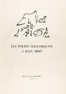 cada uno de los poemas. Compuesta a mano con tipos Bodoni fabricados expresamente para la edición de este libro y despues destruidos. Cubiertas originales con cubierta litográfica en color ilustrada por Miró. Perfecto estado. Conjunto de poemas de 19 poetas de Mallorca (Miquel Dolç, Robert Graves, Guillem Colom, Josep Mª Llompart, etc.) Edición limitada y numerada de 590 ejemplares sobre papel litos de Sarrió.