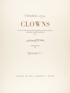 1975. (BIBLIOFILIA). GOMEZ DE LA SERNA, RAMON; POZA, SILVINO [ilustrador]: CLOWNS. Madrid: Ediciones de Arte y Bibliofilia, 1975. Gran foliol. 70 p. aprox. Precioso libro con textos de Ramon Gomez de la Serna y 10 magnificos aguafuertes de Silvino...