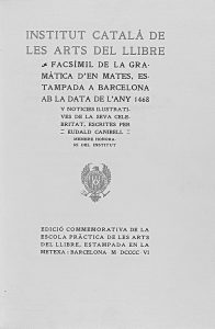 Enc. en cartoné, tejuleo, cortes superior pintado. Edición conmemorativa de la Escola Pràctica de les Arts del Llibre, estampada en la misma. Tiraje numerao de 150 ejemplares. Si la fecha que consta en el colofón de la edición original fuera cierta, se trataria del primer libro en producción tipográfica producido en la Península Ibércia. Tal fecha ha sido muy controvertida y actualmente se considera errada, siendo la correcta 1488.