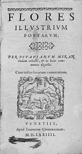 1574. (LITERATURA). MIRAN, OCTAVIANUM: FLORES ILLUSTRIUM POETARUM. Venetiis: apud Ioannem Comezinum, 1574. 8º menor. 669 p., 2 h. Enc. en pergamino, lomo rotulado.