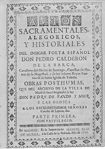 1717. (LITERATURA). CALDERON DE LA BARCA, PEDRO: AUTOS SACRAMENTALES, ALEGORICOS, Y HISTORIALES DEL INSIGNE POETA ESPAÑOL DON PEDRO CALDERON DE LA BARCA... OBRAS POSTHUMAS. Madrid: Imp. Manuel Ruiz de Murga, 1717. 6 vols. en 8º mayor. I: 16 h. +...