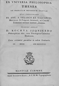 1778. (CIENCIAS). VELASCO ET VALCARCEL, IO. ANT.: EX UNIVERSA PHILOSOPHIA THESES AD PROBATAM METHODUM EXACTAE. Mantuae Carpent.: Apud Ioachinum Ibarra, 1778. 4º menor. 2 h. + XXXVI p., 5 láms. plegadas y un retrato de Carlos III. Enc. en cartoné.