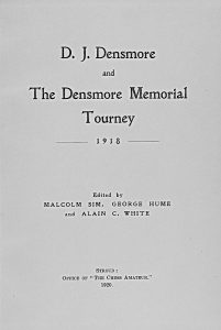 1920. (AJEDREZ). WHITE, ALAIN C. D.J. DENSMORE AND THE DENSMORE MEMORIAL TOURNEY 1918. Stroud: Office of ´The Chess Amateur´, 1920. 8º. 238 p., 1 h. Ilustr. en texto. Enc. en tela. Título rotulado en dorado en el plano anterior.