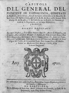 1702. (CATALUNYA-DERECHO). CAPITOLS DEL GENERAL DEL PRINCIPAT DE CATHALUNYA, COMPRATS DE ROSSELLO, Y CERDANYA, FETS EN LES CORTS CELEBRADES EN LO MONESTIR DE SANT FRANCESCH DE BARCELONA. Barcelona: Estampa de Ioan Pau Martí llibreter del General, y...