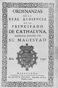 1742. (CATALUNYA). ORDENANZAS DE LA REAL AUDIENCIA DE EL PRINCIPADO DE CATHALUÑA, MANDADAS IMPRIMIR POR SU MAGESTAD. Barcelona: por Joseph Texidó, Impressor del Rey Nuestro Señor, 1742. Folio, 3 h., incluída la portada, orlada y con el escudo de...