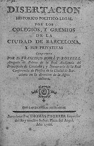 1766. (BARCELONA). ROMA Y ROSSELL, FRANCISCO: DISERTACION HISTORICO-POLITICO-LEGAL POR LOS COLEGIOS, Y GREMIOS DE LA CIUDAD DE BARCELONA, Y SUS PRIVATIVAS compuesta por…. Barcelona: por Thomas Piferrer impresor, 1766. 8º mayor. 47 p. Sutiles...