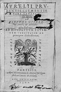 1566. PRUDENTI CLEMENTII, AURELII: AURELII PRUDENTII CLEMENTIS VIRI CONSURALIS OPERA A VICTORE GISELINO CORRECTA & ANNOTATIONIBUS ILLUSTRATA AD HIPPOLYTUM ESTENSEM CARDINALEM. Parisiis: apud Hieronymum de Marnes, 1566. 12º. 540 p., 1 h. Marca...