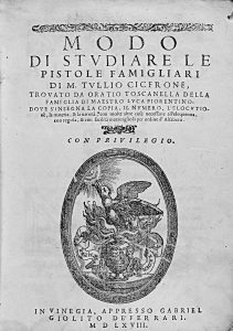 1568. (HUMANIDADES). TOSCANELLA, ORATIO: MODO DI STUDIARE LE PISTOLE FAMIGLIARE DI M. TULLIO CICERONE. Vinegia: appresso Gabriel Giolito de Ferrari, 1568. 8º mayor. 4 h. + 197 p., 1 h. Escudo xilográfico en portada y última hoja. Leve señal de...