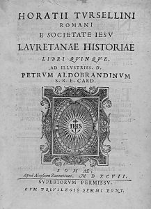 1597. (RELIGION). TURSELLINI, HORATII: LAURETANAE HISTORIAE LIBRI QUINQUE. Romae: apud Aloysium Zannettum, 1597. 8º mayor. 6 h. + 275 p., 4 h. Marca tipográfica en portada y la vuelta de la última hoja; grabado a plena página en la vuelta de la...