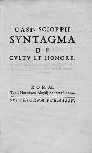 1606. (HUMANIDADES). SCIOPII, GASP.: SYNTAGMA DE CULTU ET HONORE. Romae: typis Haeredum Aloysii Zannetti, 1606. 8º menor. 8 h. + 204 p., 3 h. Antiguo cerco de humedad en una esquina. Enc. semidesprendida en pergamino.