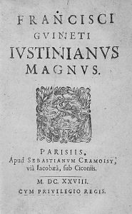 1628. (HUMANIDADES). GUINETI, FRANCISCI: IUSTINIANUS MAGNUS. Parisiis: apud Sebastianum Cramoisy, 1628. 8º. 16 h. + 219 p., 2 bl. [Sigue:] ORATIO. 7 p., 231-261 p. Enc. en pergamino, lomo rotulado.