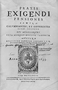 1635. (HUMANIDADES). BARBOSA, AGUSTINO: PRAXIS EXIGENDI PENSIONES CONTRA CALUMNIANTES ET DIFFERENTES ILLAS SOLVERE : CUI ACCESSERUNT VOTA ALIQUOT DECISIVA CANONICA. Barcinone : apud Gabrielem Nogues ... : expensis Francisci Menescal, 1635. Folio. 44...