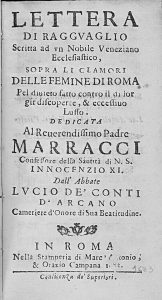 1683. CONTI D´ARCANO, LUCIO DE: LETTERA DI RAGGVALIO SCRITTA AD UN NOBILE VENEZIANO ECCLESIASTICO SOPRA IL CLAMORI DELLE FEMINA DI ROMA. Roma: nella stamperia di Marco Antonio & Orazio Campana, 1683. 12º. 12 h. + 84 p. Viñetas. Enc. en pergamino.