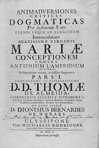 1750. (RELIGION). ALMEIDA, THOMAE: ANIMADVERSIONES CRITICAS DOGMATICAS PRO SUSTINENDO VOTO TUENDI USQUE AD SANGUINEM IMMACULATAM BEATISSIMAE VIRGINIS MARIAE CONTEPTIONEM CONTRA ANTONIUM LAMPRIDIUM. Ulyssipone: typis Michaelis Rodrigues, 1750. 2...
