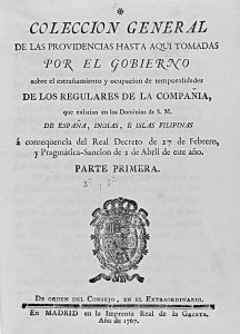 E ISLAS FILIPINAS á conseqüencia del Real Decreto de 27 de Febrero, y Pragmática -Sancion de 2 de Abril de este año. Parte primera, segunda y tercera...Contiene el por menor de los destinos dados á sus Colegios é Iglesias, consistentes en la Península, é Islas adyacentes, y la regla que se ha de observar para lo mismo en los Dominios ultramarinos. Madrid: en la imprenta Real de la Gazeta. 1767. 4º. 2 h. 157 p. 2 h. 143 p. 2 h. 160 p. Pergamino.