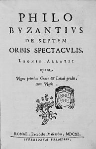 1640. (HISTORIA). ALLATII, LEONIS: PHILO BYZANTIUS DE SEPTEM ORBIS SPECTACULIS. Romae: ex. Mascardus, 1640. 8º menor. 4 h. + 112 p. Texto en griego y latín. Enc. en pergamino.