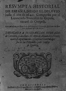 1654. CEPEDA, FRANCISCO DE: RESUMPTA HISTORIAL DE ESPAÑA, DESDE EL DILUVIO HASTA EL AÑO DE 1642. Madrid: Diego Diaz de La Carrera, 1654. 8º mayor. 6 h. + 175 fol., 1 h. de colofón. Papel muy tostado. Enc. de época en pergamino, rotura en el lomo.