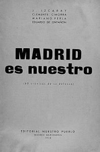 1938. (GUERRA CIVIL). IZCARAY, JESUS; CIMORRA, CLEMENTE; PERLA, MARIANO; ONTAÑON, EDUARDO DE: MADRID ES NUESTRO (60 CRONICAS DE SU DEFENSA). Prólogo del General Miaja. Madrid-Barcelona: Ed. Nuestro Pueblo, 1938. 4º. 190 p., 2 láminas (la ciudad...