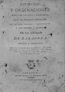 1732. (ZARAGOZA). ESTATUTOS Y ORDINACIONES ACERCA DE LAS LITES Y DIFERENCIAS QUE SE PUEDEN OFRECER EN LAS COSAS TOCANTES Y PERTENECIENTES A LOS MONTES Y HUERTAS DE LA CIUDAD DE ZARAGOZA. Zaragoza: Oficina de Medardo Haras, 1732. 8º. Portada + 6 h....