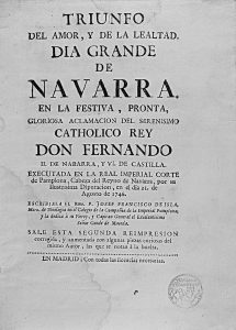 1746. ISLA, JOSÉ FRANCISCO DE. TRIUNFO DEL AMOR Y DE UNA LEALTAD. DIA GRANDE DE NAVARRA. Gloriosa aclamación del serenísimo catholico Rey Don Fernando Madrid: s.i., 1746. 4º. 92 p., 1 h. Enc. en cartoné provisional. Sello estampillado de...