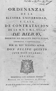 1796. (BILBAO). ORDENANZAS DE LA ILUSTRE UNIVERSIDAD Y CASA DE CONTRATACION DE LA M.N. Y M.L. VILLA DE BILBAO. Madrid: Imp. de Sancha, 1796. Folio. 2 h. + 370 p., 33 h. Papel algo tostado, puntos de óxido. Enc. en plena piel.