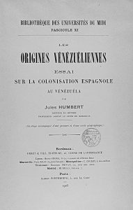 1905. (VENEZUELA). HUMBERT, JULES: LES ORIGINES VENEZUELIENNES. ESSAI SUR LA COLONISATION ESPAGNOLE AU VENEZUELA. Paris: Albert Fontemoing, 1905. Mapa desplegable. 4º menor. 337 p. Rústica edit., intonso.