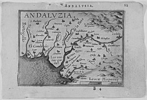 1667 ca. (ANDALUCIA). [ORTELIUS:]. ANDALUSIA/ANDALUZIA. Mapa grabado al cobre y coloreado, plancha 7,5x10,5 cm, papel 9,5x14 cm. Texto en el dorso en francés.