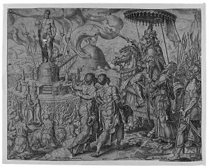 1565. HEEMSKERCK, M. [inventor]; GALLE [fecit]: ESCENA DE ANTIGUO TESTAMENTO. 19,5x25 cm. Diminutas faltas. Papel oscurecido. Montado en cartoné.