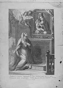 1810. (VALENCIA). N. S. DEL REMEDIO. HALLANDOSE VALENCIA DEVASTADA POR LA PESTE VORAZ DESENFRENADA, UNA VIUDA EN MARIA BUSCO EL REMEDIO, Y LA AUGUSTA SEÑORA DIO EL REMEDIO. AÑO 1348. Grabado al cobre. 35x26 cm. Sutil marca de doblez en la parte...