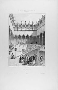 1840. (BARCELONA). PRANGER, GIRAL DE (dibujó d´aprés nature): REAL AUDIENCIA DE BARCELONA. Paris: chez Veith et Hausser; Imp. Lemercier. Litografía 44x29 cm. Lámina procedente de la obra LE MOYEN AGE PITTORESQUE.
