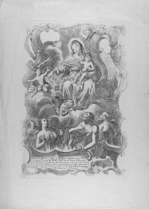 1850 ca. (VALENCIA). IMAGEN DE N.S. DEL SIFRAGIO VENERADA EN LA PARROQUIA DE SANTA CRUZ DE VAL EL ILL. S. D. F. JUAN THOMAS DE ROCAVERTI ... Valencia. Grabado al cobre. 31x21 cm. plancha; 43x31 cm. papel. Pequeñas rasgaduras en los márgenes.