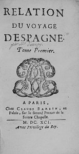 1691. (VIAJES). RELATION DU VOYAGE D´ESPAGNE. Paris: chez Claude Barbin, 1691. 3 vols. en 8º menor. I: 8 h. + 336 p.; II: 343 p.; III: 419 p. Enc. en media piel. Tomo II con leve señal de humedad en las primeras hojas. El tomo III sin portada.