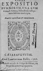 1598. NEBRIJA, ANTONIO DE: AUREA EXPOSITIO HYMNORUM, UNA CUM TEXTUM AB ANTONII NEBRISSENSIS CASTIGATIONES FIDELITER TRANSCRIPTA. Caesaraugustae: apud Laurentium Robles, 1598. 8º menor. 123 fol., 1 h. Puntos de polilla en el lomo. Pequeña pérdidas...