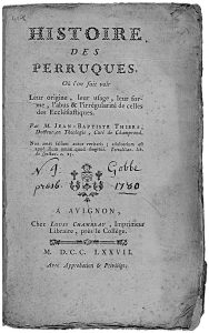 1777. (PELUQUERIA). THIERS, JEAN-BAPTISTE: HISTOIRE DE PERRUQUES ou l´on fait voir leur origine, leur usage, leur forme, l´abus & l´irregularite de celles de ecclesiastiques. Avignon: chez Louis Chambeau, 1777. 8º. XXII + 441 p. Rústica...