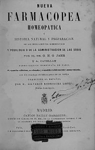 JAHR, G.H.G.; CATELLAN, A.: NUEVA FARMACOPEA HOMEOPATICA O HISTORIA NATURAL Y PREPARACION DE LOS MEDICAMENTOS HOMEOPATICOS Y POSOLOGIA. Trad. Silverio Rodriguez Lopez. Madrid: Carlos Bailly-Bailliere, 1860. 8º menor. XXII + 428 p., 20 p. Enc. en...