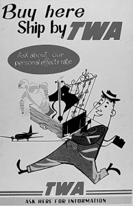 1957 ca. (AVIACION). LOTE DE 7 CARTELES Y CARTELES DE MOSTRADOR DE TWA. Técnica serigráfica, varios tamaños.