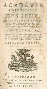 Académie universelle des jeux, contenant les règles de tous les jeux, avec des instructions faites pour apprendre à les bien jouer. Nouvelle édition, augmentée du Jeu des échecs, Par Philidor, du jeu du Whisk, par Edmond Hoyle, traduit de...
