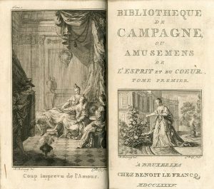 Bibliothèque de campagne ou amusemens de l'esprit et du coeur. Bruxelles, Benoît Le Francq, 1785, 12 vol. in-12, front., f. de titre avec vignette à chaque vol. et [2]-455-[1], [2]-450-[2], [4]-439-[1], [4]-472, [4]-428, [4]-426, [2]-430,...