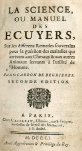 CARBON DE BEGRIÈRES. La Science, ou Manuel des ecuyers, sur les différens remedes souverains pour la guérison des maladies qui arrivent aux chevaux et aux autres animaux servants à l'utilité de l'homme. Paris, Cailleau, 1751, 8°, [8, dont...