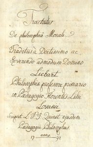 Cours manuscrit de l'Université de Louvain.- LIEBAERT (Jean-Baptiste).- « Tractatus de Philosophiâ Morali traditus à Doctissimo ac Reverendo admodum Domino Liebart Philosophiae professore primario in Paedagogio Florentis Lilii Lovanii. Scripsit...