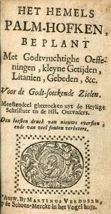 Fermoir du 18e s. en métal argenté.- Het Hemels Palm-Hofken, beplant met Godtvruchtighe Oeffeningen, kleyne Getijden, Litanien, Gebeden, etc. Antwerpen, Martinus Verdusen, [1740], petit in-12, titre-front., 386-[6] p., plein veau brun de...