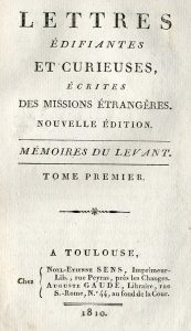 in-12, br., plein papier gris-bleu de l'époque, étiquette imprimée au dos (qq. étiquettes manquent, qq. manques de papier aux couv., qq. rares taches brunes, qq. très rares mouill.). Ex. en bon état général à toutes marges (plusieurs vol. non coupés). Comprend : t. 1-5 : Mémoires du Levant (XXIV-360 p., 2 cartes dépl. ; [4]-383-1 blanche p. ; [4]-381-1 blanche p. ; [4]-394 p., 1 carte dépl., 1 portr. h. t., 1 pl. dépl. ; [4]-432 p., 3 cartes dépl., 5 pl. dont 4 dépl.) ; t. 6-9 : Mémoires d'Amérique ([4]-XXVIII-338 p., 1 fig. h. t. ; [4]-360 p., 1 carte dépl. ; [4]-336 p., 5 cartes dépl. ; [4]-348 p., 1 carte dépl.) ; t. 10-15 : Mémoires des Indes (346 p., 1 portr. h. t. ; 330 p. ; 359-1 blanche p., 1 plan h. t., 3 fig. h. t. ; 372 p., 1 carte dépl. ; 332 p., 2 pl. dépl. ; 352 p., 4 cartes dépl.) ; t. 16-24 : Mémoires de la Chine (392 p., 1 pl. dépl. - décapitation de 4 jésuites - et 2 cartes dépl. ; 361-1 blanche p., 1 carte dépl. ; 380 p., 2 pl. dépl., 2 cartes dépl., 1 plan dépl. ; 417-1 blanche p., 1 vue dépl., 1 plan dépl., 2 pl. dépl., 4 fig. h. t., 1 portr. h. t. ; 370 p. ; 420 p. ; 423-1 blanche p. ; 492 p., 1 carte dépl. ; 444 p., 1 pl. h. t.) ; t. 25 et 26 : Mémoires des Indes et de la Chine (404 p., 1 pl. h. t. ; 408 p., 1 double planche dépl., 1 fig. dans le texte). Les « Lettres édifiantes et curieuses » forment une collection de lettres envoyées en Europe par des jésuites missionnaires en Chine, au Levant, en Inde, en Amérique, et ailleurs. Publiée entre 1702 et 1776, cette collection fit beaucoup pour ouvrir l'Europe, et surtout la France, aux cultures non européennes. Pour que la Compagnie de Jésus s'appuie sur une bonne information, Ignace de Loyola établit un système de correspondance prévoyant que tout jésuite ayant autorité lui écrive régulièrement (Constitutions, no 674, 790). Il y a ainsi les relations annuelles des diverses missions, et les autres lettres, adressées plus personnellement à Ignace, au ton plus chaleureux. Du vivant du saint, quelques lettres envoyées de l'Inde par François Xavier (janv. 1544, avr. 1552, etc.) sont à l'origine de nombreuses vocations missionnaires. Comme tout le travail apostolique, en Europe aussi bien qu'en mission, dépend de la générosité de bienfaiteurs, il est important d'informer ceux-ci régulièrement sur ce qui se fait avec leurs dons. Il y a deux types de lettres, les lettres d’affaires, qui traitent des personnes et des problèmes à résoudre, et les autres, qui parlent du travail apostolique, de son développement et de ses succès. Les premières sont à usage interne et destinées strictement au gouvernement interne de la Compagnie, les autres (les « édifiantes ») sont copiées et répandues parmi les amis, prélats, et bienfaiteurs divers. Elles connaissent un grand succès. Durant les 16e et 17e s., les voyages outre-mer (à but commercial) se multipliant entre l'Europe et les autres continents, surtout Amérique et Asie, il se développe une grande curiosité que les marchands, qui n'ont que des contacts épisodiques avec ces « nouveaux pays », ne sont pas en mesure de satisfaire. Les missionnaires, qui y habitent et en ont appris la langue, sont de bons observateurs (en raison de leur formation intellectuelle) et peuvent répondre à cette demande. À l'aspect « édifiant » de leurs lettres ils ajoutent le « curieux ». En plus de relater les souffrances des missionnaires, les joies de nombreux baptêmes, les martyres également, ils proposent dans la même correspondance de véritables reportages sur la Chine, son mode de gouvernement, les particularités de sa langue, ses moeurs et coutumes. Tout cela donne naissance à la première sinologie européenne et suscite un véritable engouement pour les « chinoiseries » et tout ce qui vient de l'empire du Milieu. D'autres lettres circulent, en provenance d'Amérique, du Levant ou de l'Inde, mais ce sont les lettres de Chine qui ont le plus grand retentissement (Wikipédia).