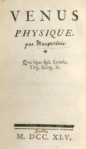 ajout à l'encre du nom de l'auteur au titre). Édit. orig. L'ouvrage est divisé en deux parties : "Dissertation sur l'origine des hommes et des animaux" et "Dissertation sur l'origine des noirs". La première partie avait déjà été en partie publiée un an auparavant sous le titre : "Dissertation physique à l'occasion du nègre blanc". Elle relatait le cas d'un noir albinos. Dans ce petit livre Maupertuis expose ses idées qui ont fait de lui un théoricien des sciences de la vie; "ouvrage important pour l'étude des concepts biologiques au XVIIIe siècle", selon René Taton. Pour lui, des variations fortuites expliquent l'apparition d'espèces nouvelles. Il est ainsi un des précurseurs du transformisme, ouvrant la voie à la génétique. Mathématicien, astronome, philosophe, Maupertuis convertit Voltaire au système de Newton.
