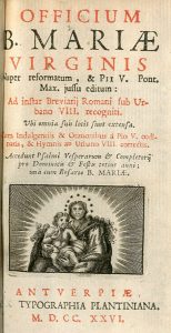 Impression plantinienne.- Officium B. Mariae Virginis [...]. Antverpiae, Ex Typographia Plantiniana, 1726, in-32 (12 x 7 cm), [34]-420-[2] p., nombr. fig. dans le texte, impression en rouge et noir, plein maroquin noir de l'époque, dos à nerfs,...